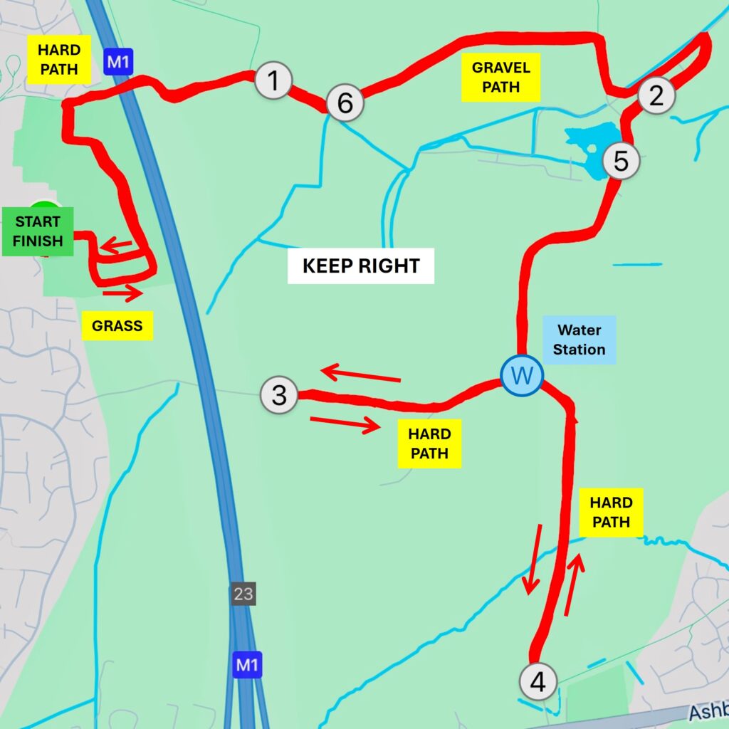 The course has a mix of grass, gravel and hard surfaces. This includes gravel paths in the Garendon Park which may become muddy and have puddles after heavy rain. Trail shoes are recommended if there has been heavy rain. Spikes are not advised due to hard surfaced paths.